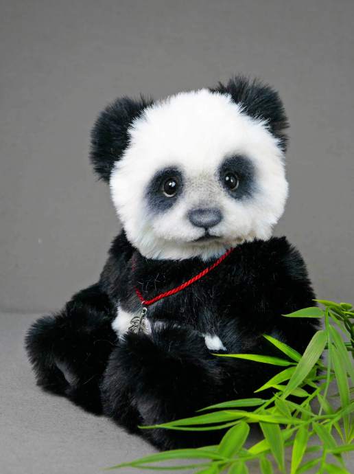 Panda „Sumie“, Unikat, 24 cm, hochwertiges Webfell (sehr weich) und Wolle, 5-fach gegliedert, Suédine-Pfoten, gefilzte Augenlider.