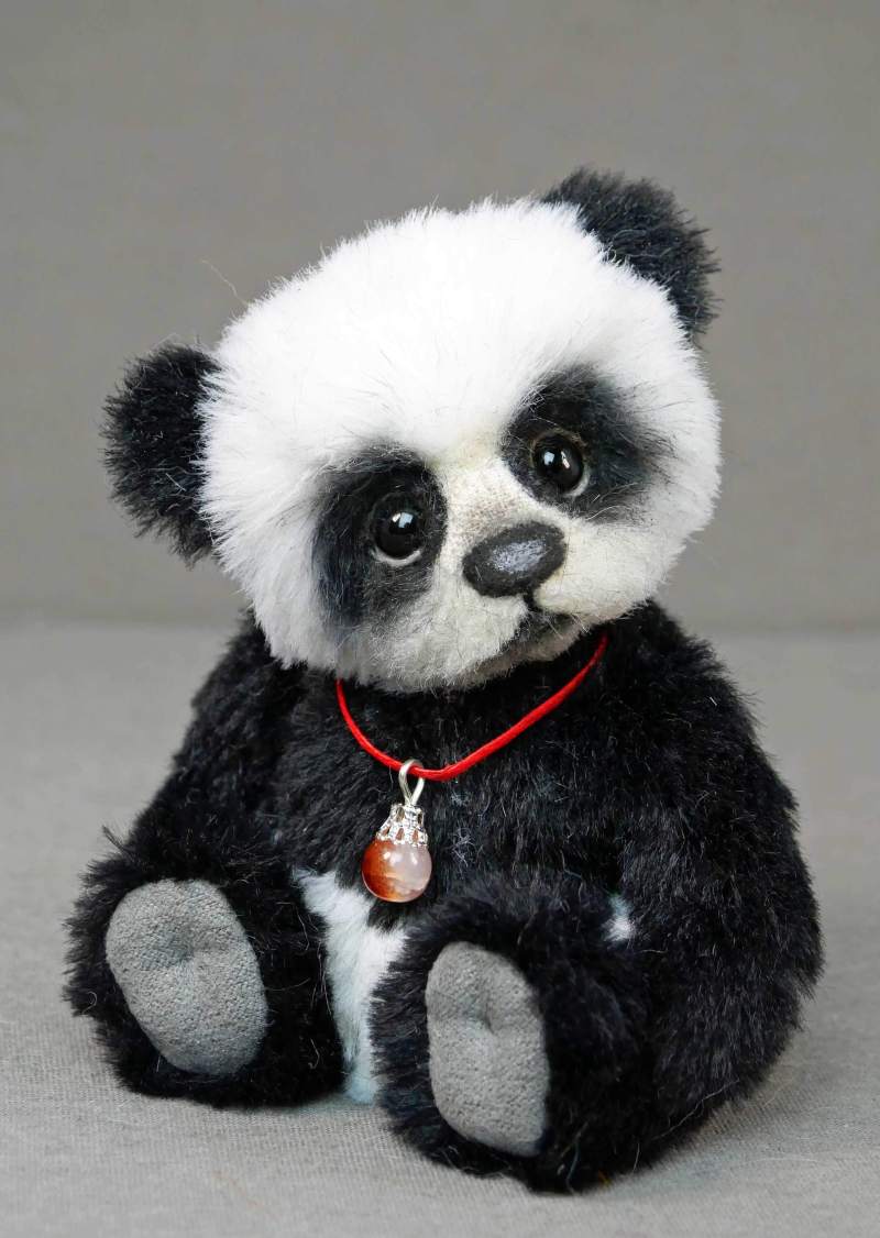 Panda „Dim“, Unikat, 12 cm, hochwertiges Webfell und Wolle, 5-fach gegliedert, Suédine-Pfoten, gefilzte Augenlider.
